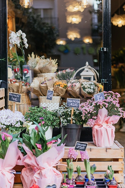 La boutique a été pensée dans une palette de tons rose poudré, vert tendre et blanc, pour un accueil chaleureux et délicat. L’agencement évolue au fil des saisons, avec des mises en scène florales et décoratives renouvelées pour chaque période de l’année.