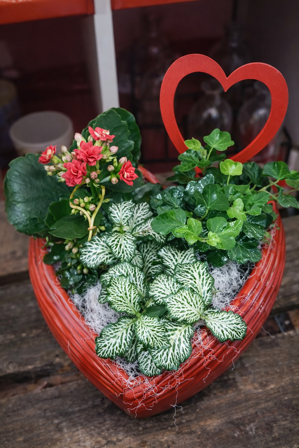 Charmante composition de plantes vertes et fleuries présentée dans un contenant en forme de cœur. Agrémentée d’un décor cœur rouge, elle associe feuillages graphiques et floraison délicate pour une création pleine de fraîcheur et de romantisme. Un cadeau idéal pour la Saint-Valentin ou pour faire plaisir avec douceur.
